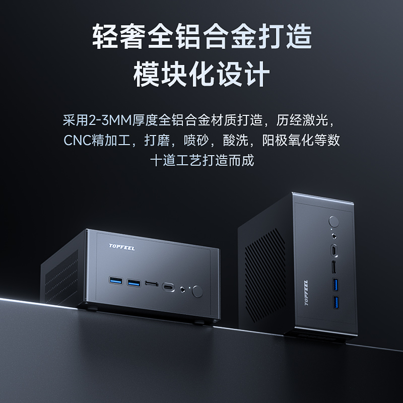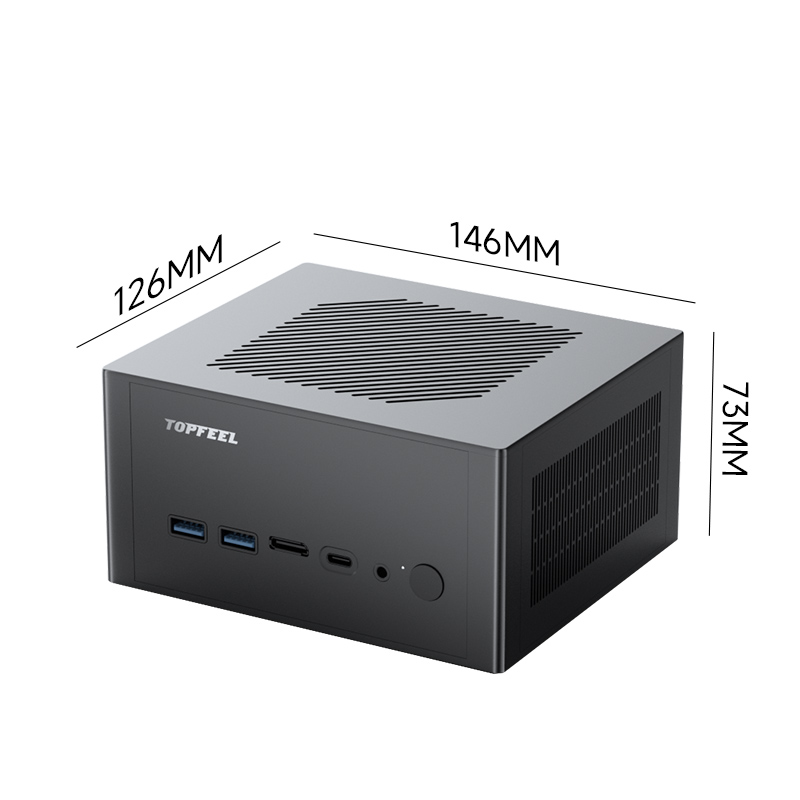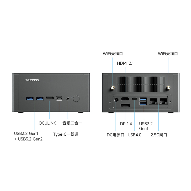 前置:USB 3.2 Gen2 *1,USB 3.2 Gen1 *1,Oculink*1,Type-C(10G,一线通,支持对外输出5V 3A),开关按钮*1,音频*1