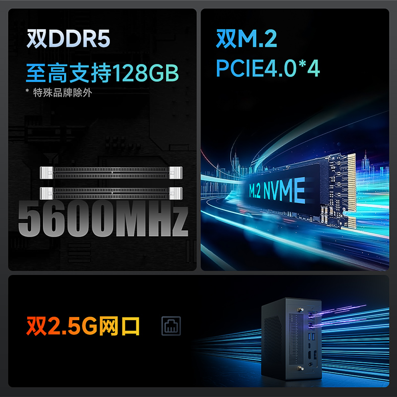 后置:USB 3.2 Gen1 *2,USB 4.0 *1(40G,一线通,支持对外输出5V 3A),HDMI 2.1*1,DP1.4*1,2.5G RJ45*2,DC5525*1,